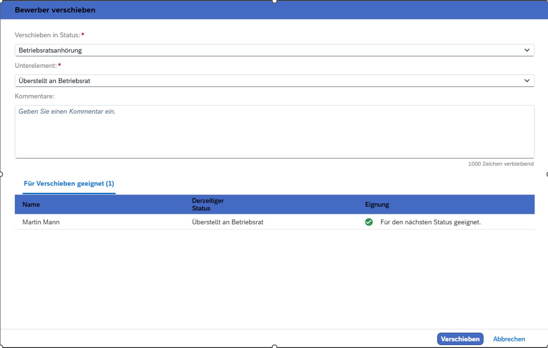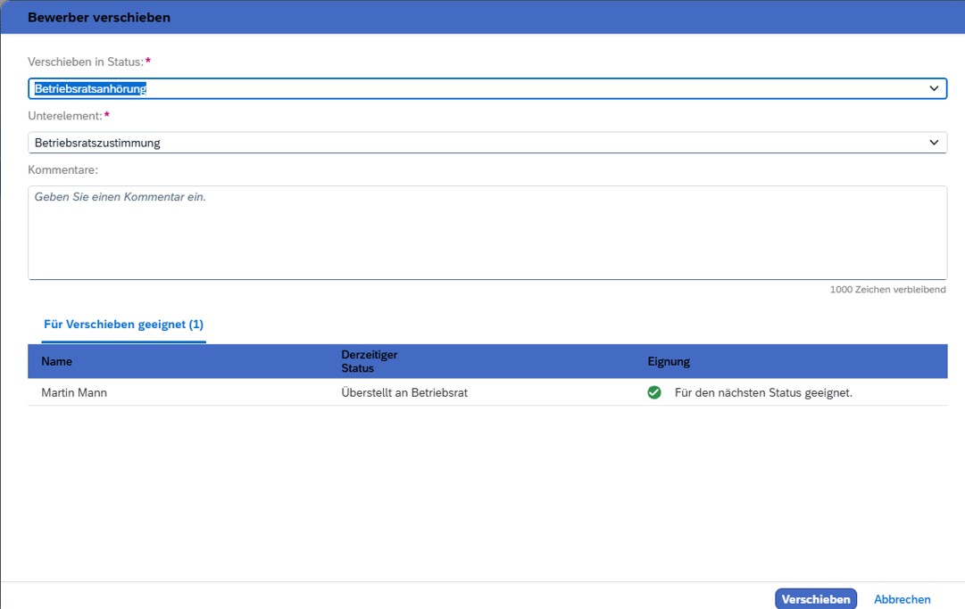Basierend auf der Entscheidung, kann eine Begründung hinzugefügt werden, und die Kandidat:innen in die Folgestatus „Betriebsratszustimmung“ oder „Betriebsratsablehnung“ verschoben werden.