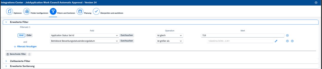 Die Filter schränken ein, dass nur Bewerbungen aus dem Status „Überstellt an den Betriebsrat“ berücksichtigt werden und auch nur Bewerbungen, die mindestens eine Woche in dem Status liegen.